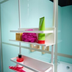 • Opslagruimte: Het rek is uitgerust met 2 schappen die voldoende ruimte bieden voor toiletartikelen, zoals shampooflessen, zeep en scrubs. De stangen houden hogere flessen op hun plek en kunnen daarnaast ook gebruikt worden om handdoeken aan op te hangen.