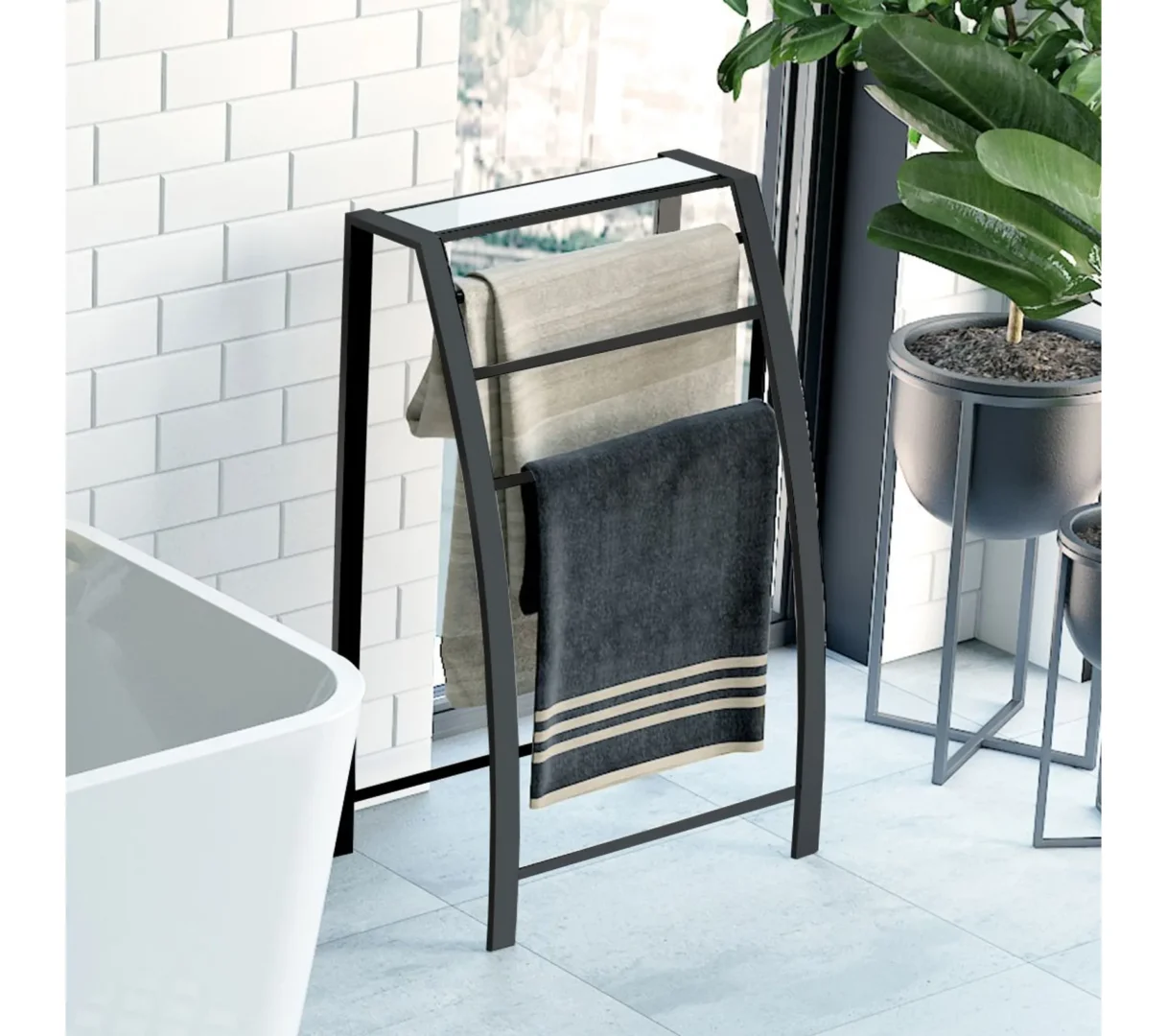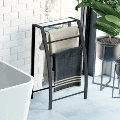 De Allibert LOFT-GAME vrijstaande handdoekhouder met 3 stangen in mat zwart biedt een stijlvolle en praktische oplossing voor het netjes opbergen van handdoeken in je badkamer. Met zijn strakke, moderne design past dit handdoekrek perfect in een industriële of moderne badkamerstijl. De matzwarte afwerking voegt een chique touch toe, terwijl het melkglazen schap bovenop extra ruimte biedt voor accessoires of verzorgingsproducten. Het robuuste ontwerp zorgt ervoor dat deze handdoekhouder jarenlang meegaat, en het vrijstaande karakter maakt hem makkelijk verplaatsbaar.