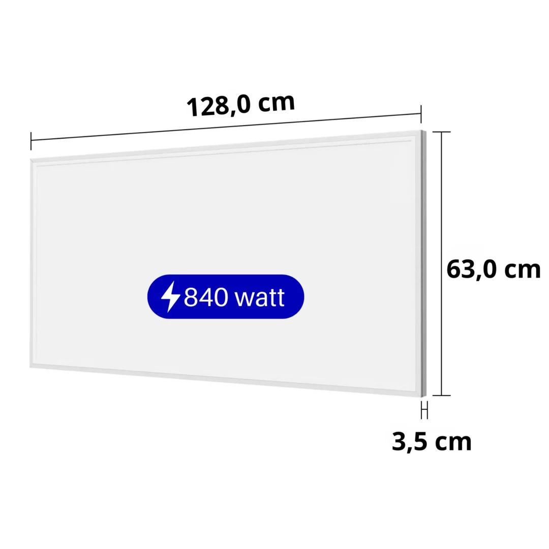 Belangrijkste kenmerken Infrarood paneel voor plafondmontage Vermogen: 840 watt Afmetingen: 63,0 × 128,0 × 3,5 cm Rondom voorzien van dimbare LED-verlichting Lichtkleur instelbaar: warm wit, daglicht en koel wit Maximale lichtopbrengst circa 3300 lumen Inclusief draadloze bedieningsconsole met thermostaat en programmafunctie Oppervlaktetemperatuur circa 110 tot 130 graden Achterzijde geïsoleerd