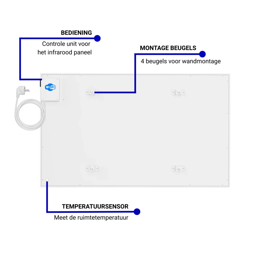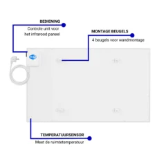 Type: Infrarood stralingspaneel Kleur: Wit Afmeting paneel: 60 x 120 x 1,2 cm (L x B x H) Totale diepte inclusief beugels: ca. 3,8 cm Vermogen: 720 Watt Montage: wandmontage of vrijstaand (geen plafondmontage) Bediening: geïntegreerde thermostaat met LCD-scherm + afstandsbediening Wifi: bediening via Tuya Smart Life app Temperatuursensor: geïntegreerd + extra tweede sensor met 150 cm snoer Opwarmtijd: < 5 minuten Efficiëntie: > 98% omzetting van elektriciteit naar warmte Voeding: 230V, netsnoer van ca. 150 cm met aangegoten stekker IP-klasse: IP24 Beveiliging: thermische beveiliging tegen oververhitting Meegeleverd: vaste voetjes