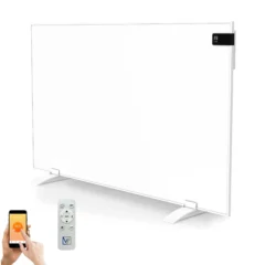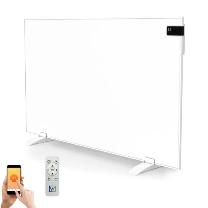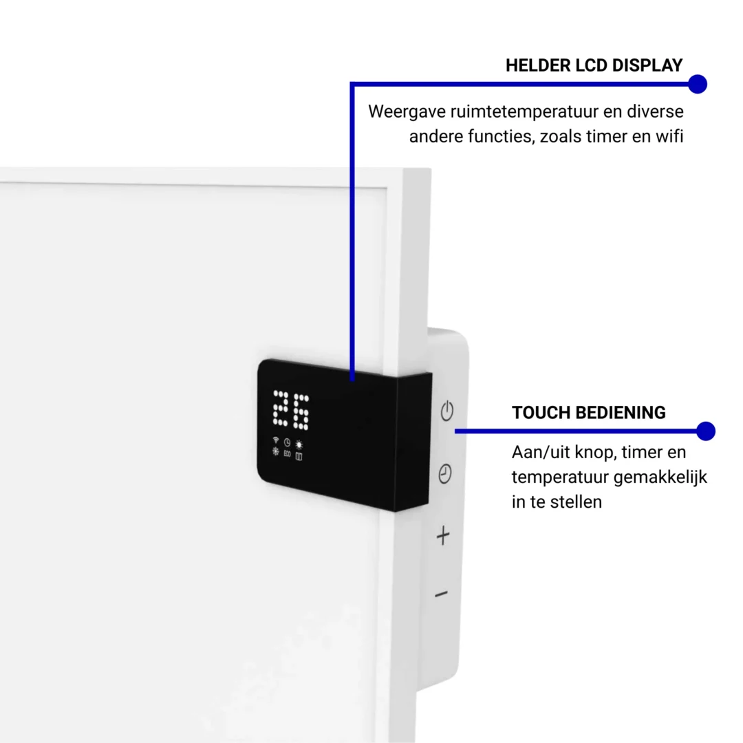 Dankzij de geïntegreerde thermostaat met wifi is dit paneel een echte Plug & Heat-oplossing. De thermostaat is te bedienen via de knoppen aan de zijkant van het paneel en beschikt aan de voorzijde over een zwart LCD-scherm waarop de temperatuur en functies duidelijk worden weergegeven. Via de wifi-verbinding kan het paneel ook op afstand worden bediend met de gratis Tuya Smart Life-app. Voor extra gebruiksgemak wordt standaard een afstandsbediening meegeleverd.