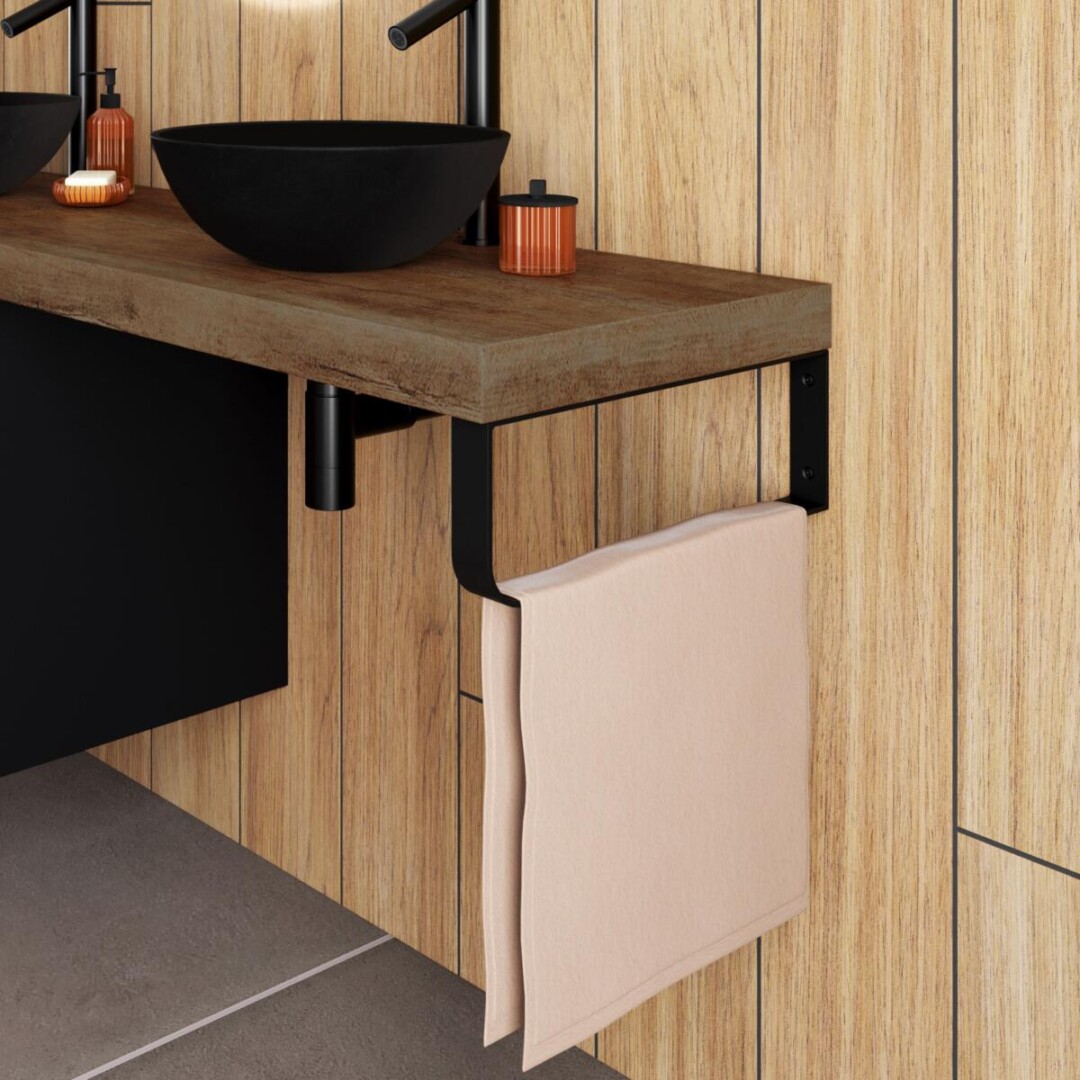 De beugel kan gebruikt worden als handdoek beugel en drager voor het wastafelblad in 1 toepassing.