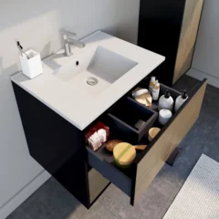 De Allibert SUNSET set 60 cm met spiegel en glanzend witte porseleinen wastafel is de perfecte compacte oplossing voor moderne badkamers. Deze set combineert een strak en stijlvol design met praktische functies, ideaal voor kleine ruimtes. De glanzend witte wastafel en de minimalistische onderkast zorgen voor een frisse en tijdloze uitstraling, terwijl de soft-close laden en bijpassende spiegel extra functionaliteit en comfort toevoegen.