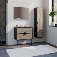 De bijgeleverde spiegel vergroot het ruimtelijke gevoel en sluit naadloos aan bij het strakke, minimalistische ontwerp van de set. De combinatie van houttinten (Natuurlijk Vintage Eik) en matzwart zorgt voor een fraai contrast, ideaal voor liefhebbers van moderne en industriële stijlen.
