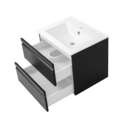 De mat zwarte afwerking geeft het meubel een rustige en stoere uitstraling en laat zich eenvoudig combineren met lichte materialen, houttinten of zwarte accenten in de badkamer.