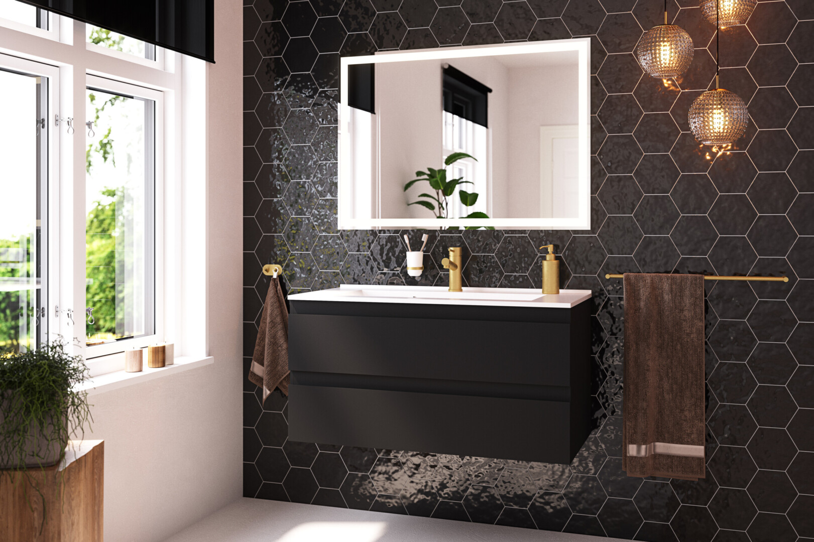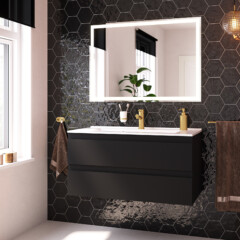 De mat zwarte afwerking geeft het meubel een rustige en stijlvolle uitstraling en laat zich eenvoudig combineren met lichte materialen, houttinten of zwarte accenten in de badkamer.