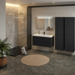 Ontdek de moderne uitstraling van de Finn wastafelonderkast 100 in mat zwart. Met strakke lijnen en een matte afwerking voegt deze onderkast een eigentijdse touch toe aan je badkamer. De royale breedte van 100 cm biedt voldoende opbergruimte met handige lades . Het matte zwart zorgt voor een stijlvol contrast en maakt de Finn onderkast zowel praktisch als esthetisch voor jouw badkamer. Upgrade je badkamer met de Finn wastafelonderkast en geniet van een slimme combinatie van design en functionaliteit.