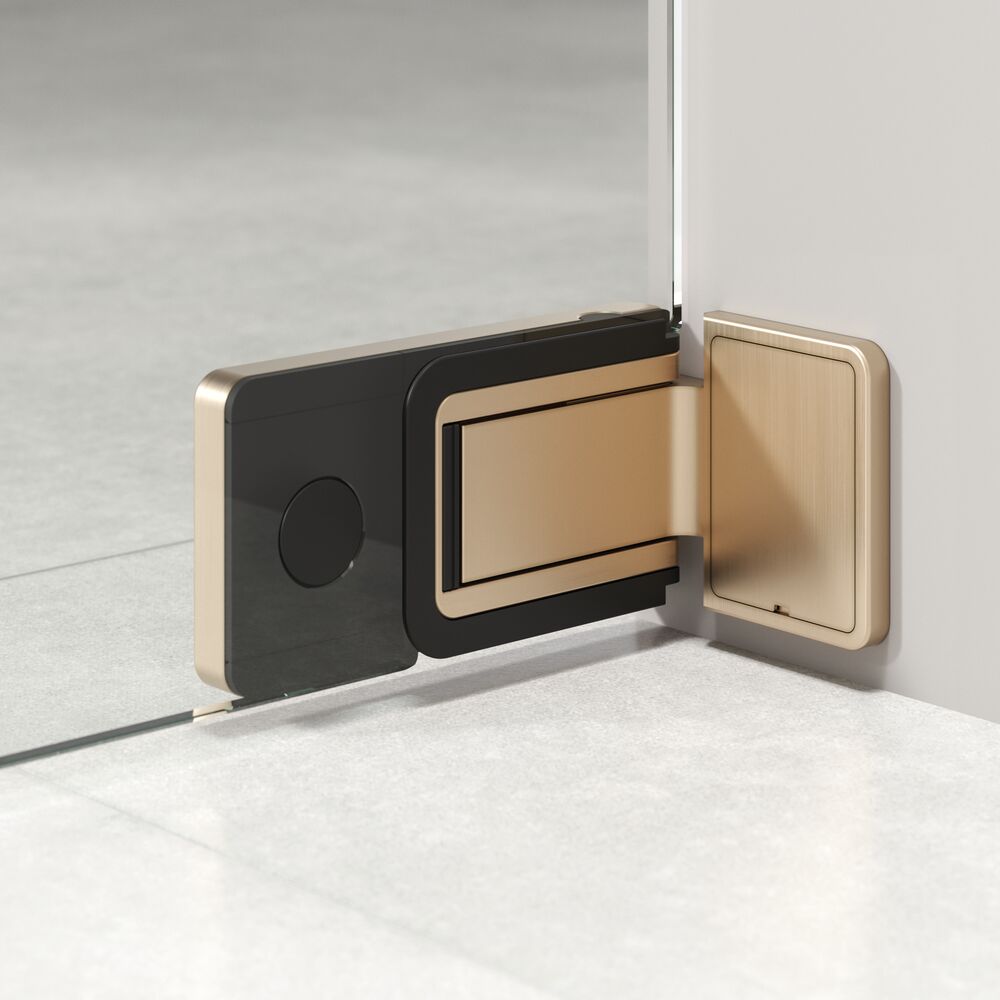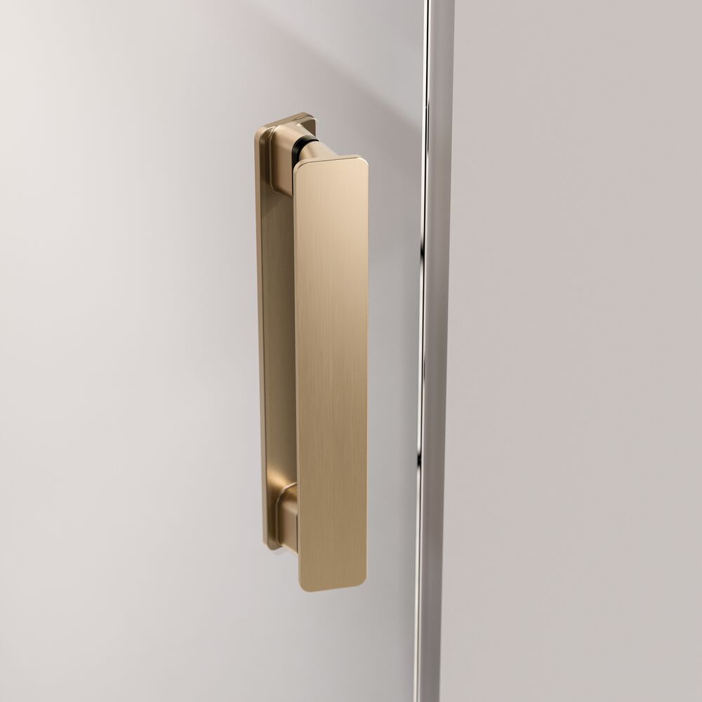 Het minimalistische ontwerp van de draaideur creëert een ruimtelijk en open gevoel in de badkamer, terwijl de afwerking in geborsteld goud een vleugje elegantie toevoegt. De deur kan zowel naar binnen als naar buiten worden geopend en beschikt over een handig autoclose-systeem dat zorgt voor een zachte en veilige sluiting. De scharnieren en de handgreep in geborsteld goud zorgen voor een tijdloze en chique uitstraling die past in een moderne badkamerstijl.