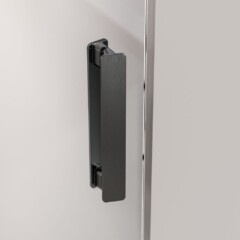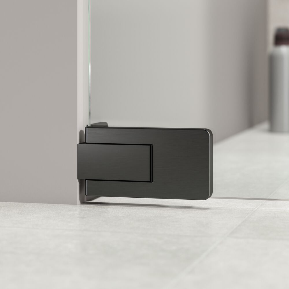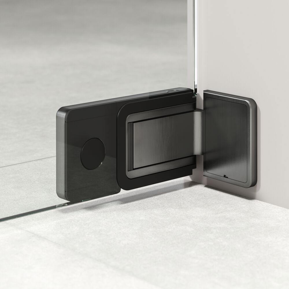 Het profielloze ontwerp zorgt voor een minimalistische look en laat de aandacht volledig op het glas vallen. De draaideur kan zowel naar binnen als naar buiten worden geopend, wat het gebruiksgemak verhoogt en de ruimte optimaal benut. Voor extra gemak is de deur voorzien van een auto close-systeem, waardoor deze soepel en automatisch sluit. De scharnieren en handgreep zijn stijlvol uitgevoerd in geborsteld gunmetal grijs, wat een tijdloze elegantie aan je badkamer toevoegt.