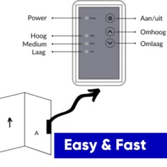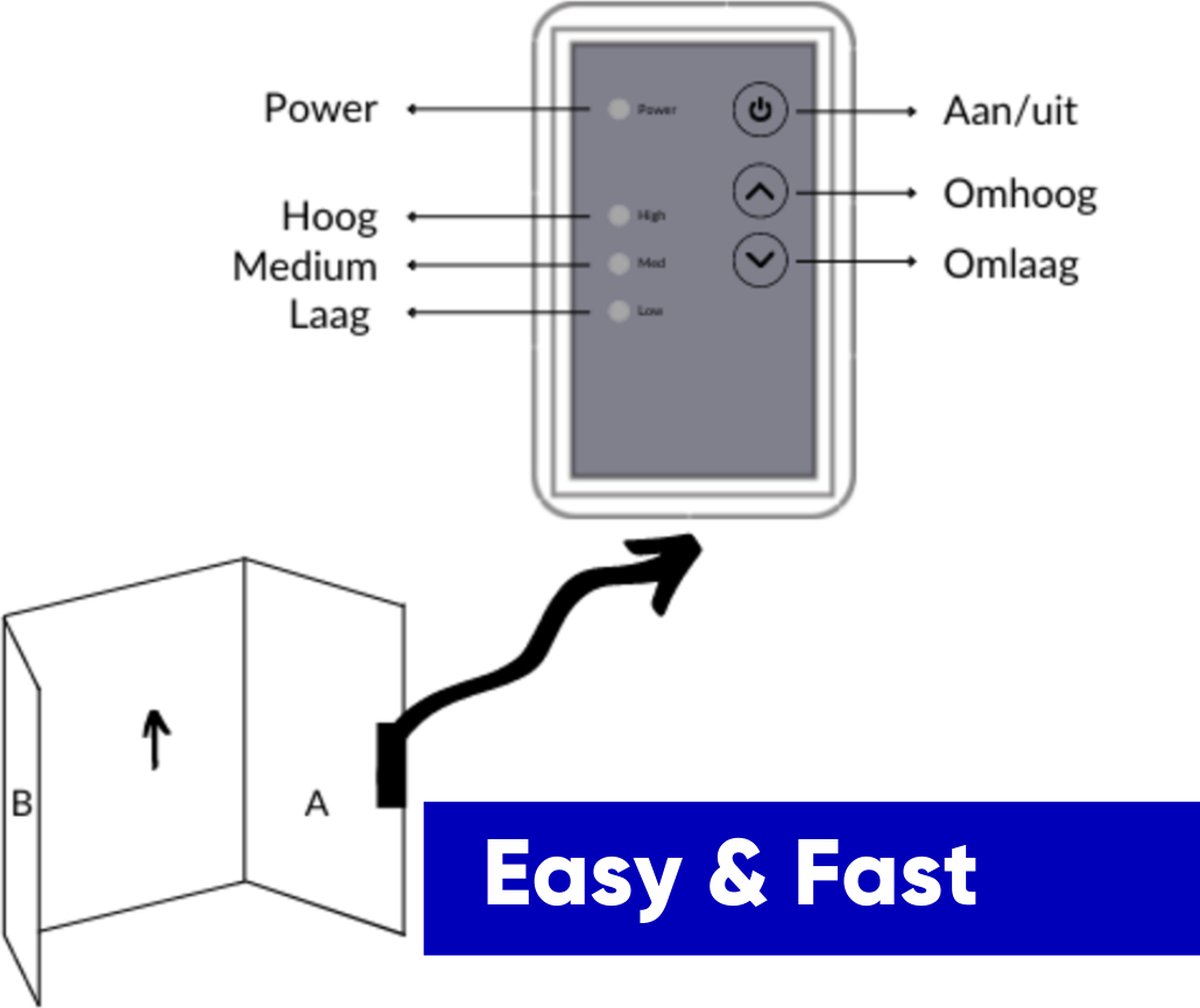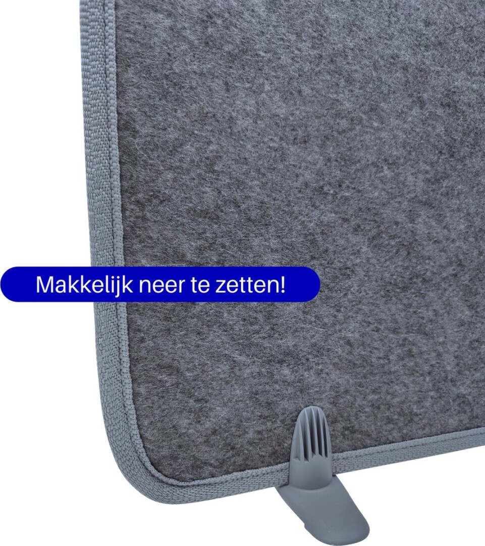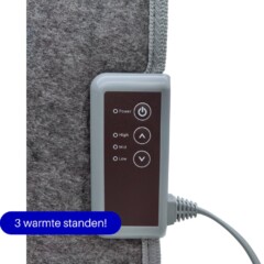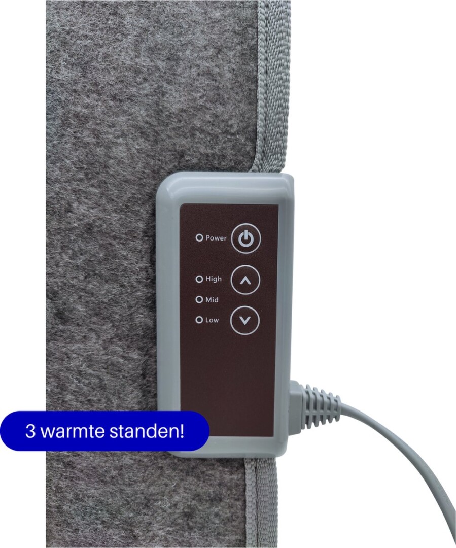 Het paneel is voorzien van een geïntegreerde bediening met drie warmtestanden (circa 40 °C, 50 °C en 60 °C), zodat je de warmte eenvoudig afstemt op jouw voorkeur. De stabiele constructie zorgt ervoor dat het paneel stevig rechtop blijft staan, terwijl de omvalbeveiliging en automatische uitschakeling na 3 uur extra zekerheid bieden tijdens gebruik.