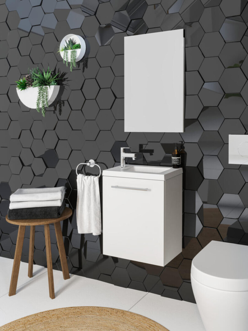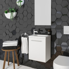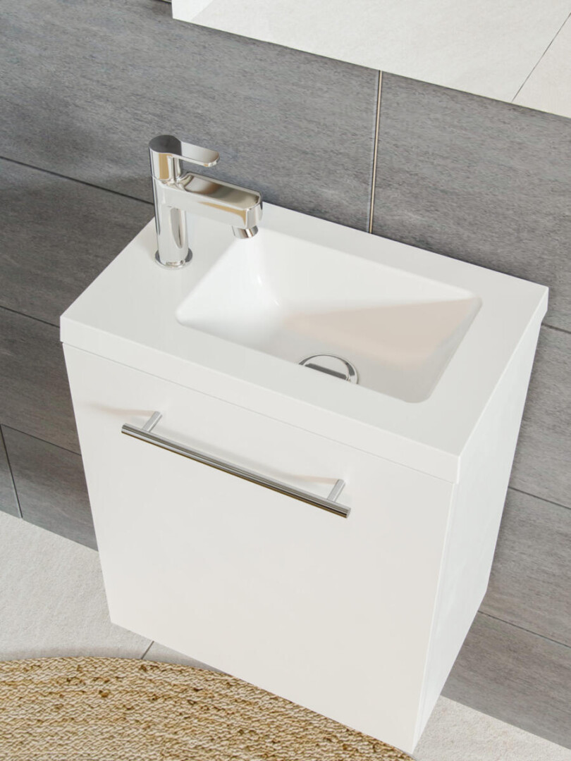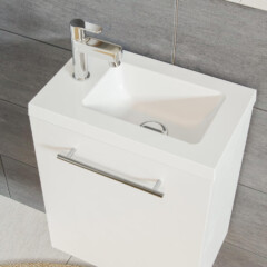 De bijpassende wastafel van 40cm voegt een vleugje luxe toe aan je dagelijkse routine. Met zijn gladde oppervlak en praktische afmetingen is het zowel functioneel als stijlvol. Dankzij het hoogwaardige materiaal is het gemakkelijk schoon te maken en bestand tegen dagelijkse slijtage.